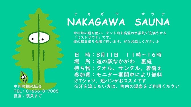 8月11日、道の駅夏祭りに、持ち込み企画としてテントサウナ体験コーナーが登場します。