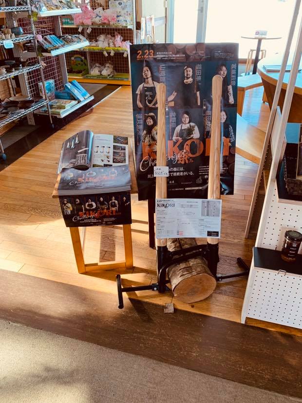 来月23日に開催される「第7回KIKORI祭り」のPRを兼ねて、祭りのメインとなる「丸太レース」で使用される「がんた」という道具を展示しています。