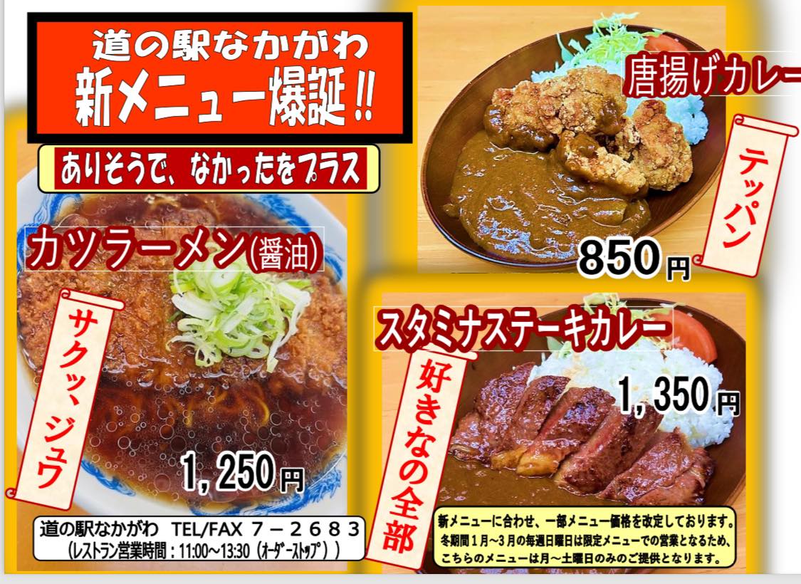 道の駅なかがわの最強アイテム、ロースカツ、唐揚げ、ステーキを新メニューに盛り込みました。